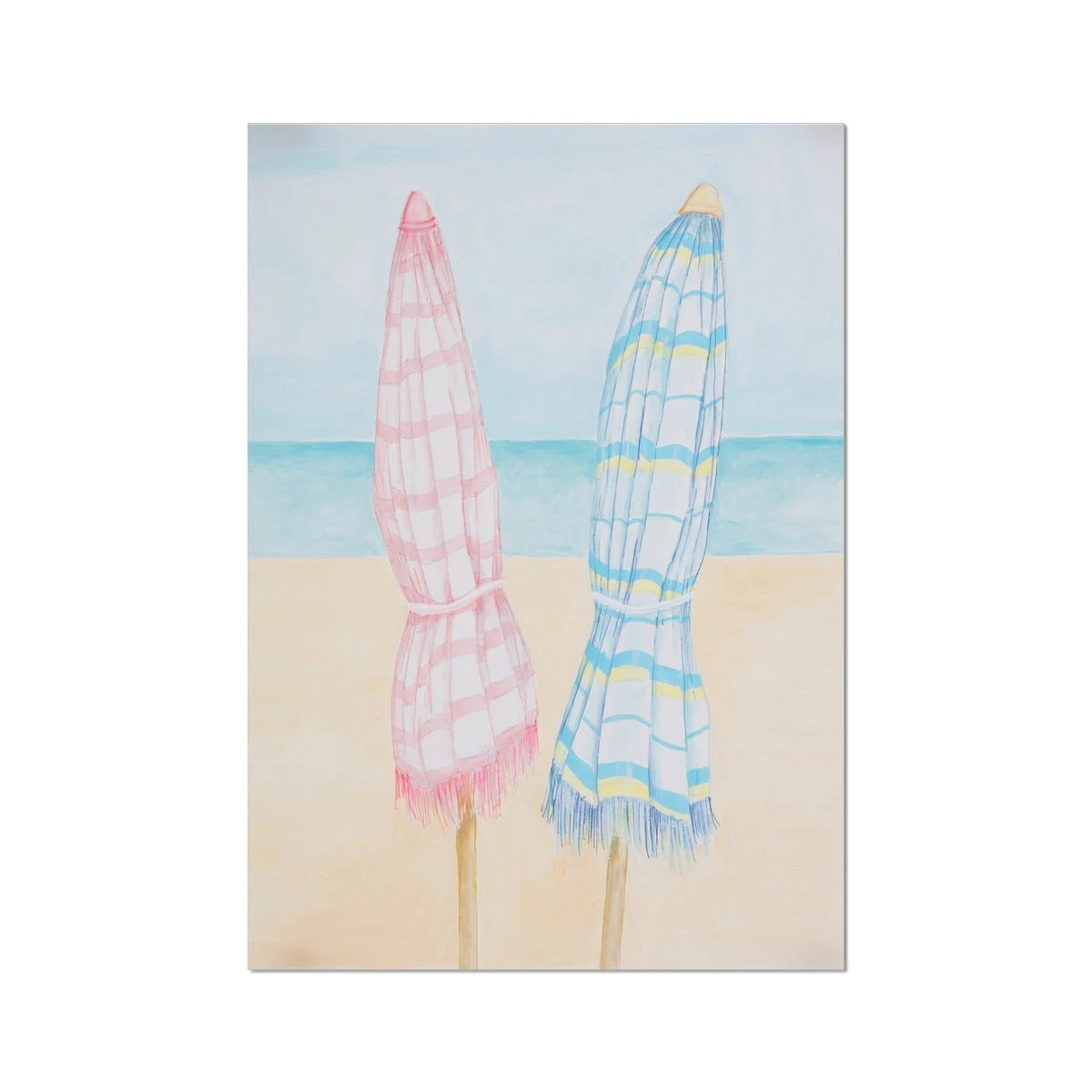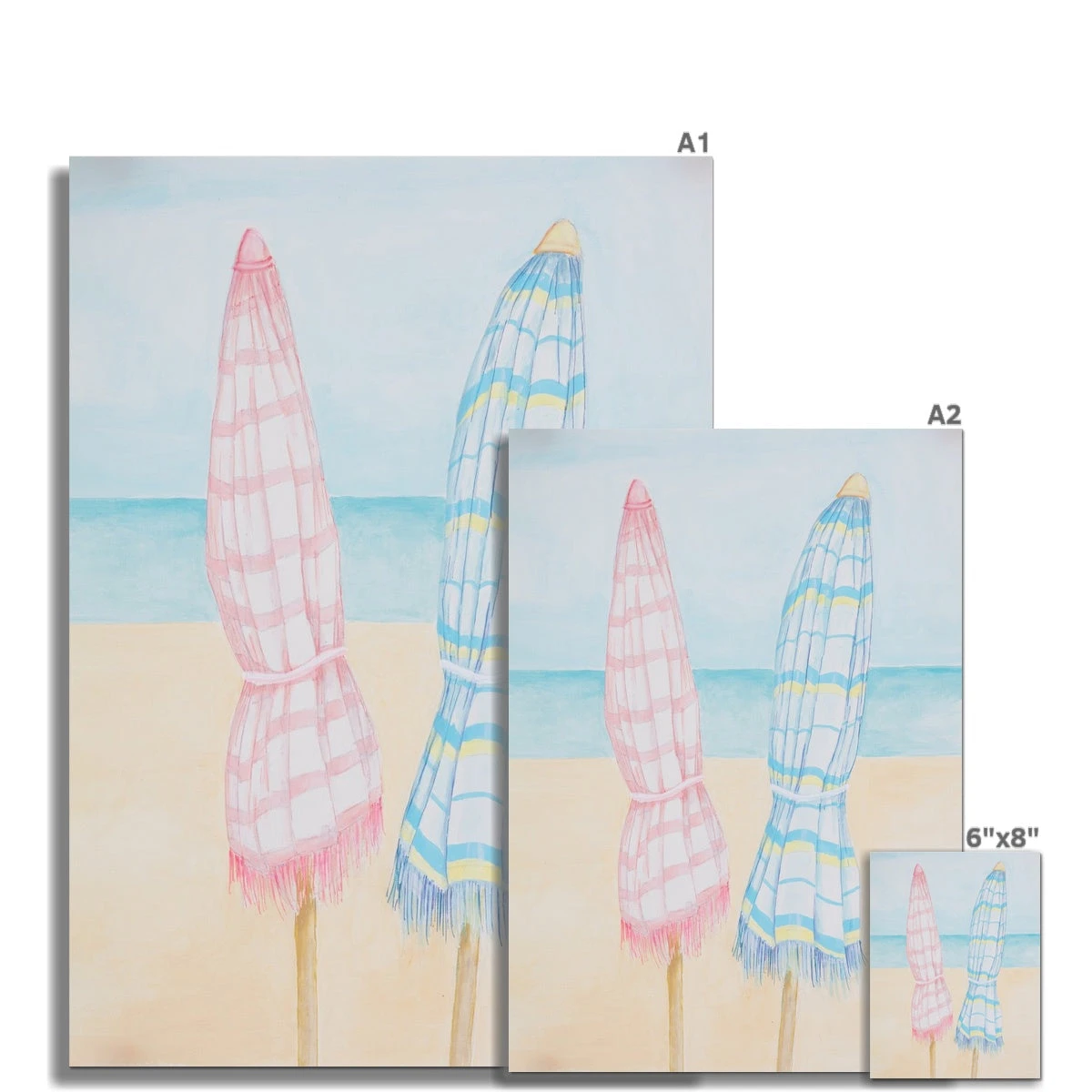 Create a coastal oasis in your space with this beach painting of two pastel striped umbrellas. The calming and refreshing vibes of this fine art print will transport you to a peaceful day at the beach. Transform your interior with the beauty and tranquility of the coast.