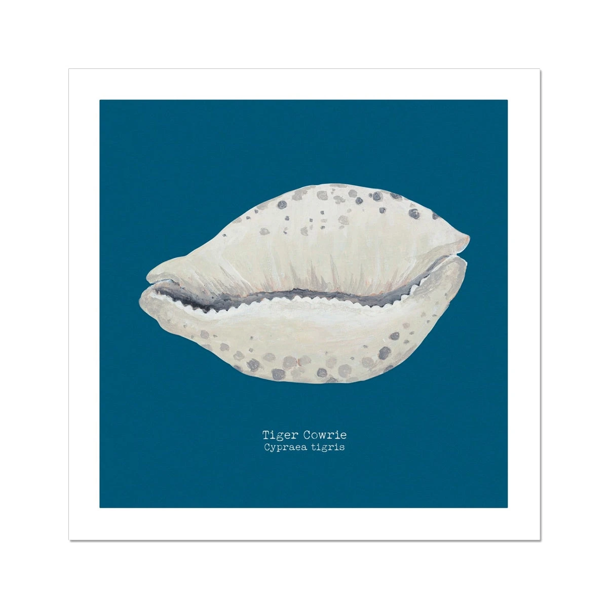 Discover the intricate beauty of the Tiger Cowrie, captured in exquisite detail in this stunning shell art print. Based on an original hand-painting, this print showcases the unique form and texture of this exotic seashell against a sophisticated Marine Blue background.