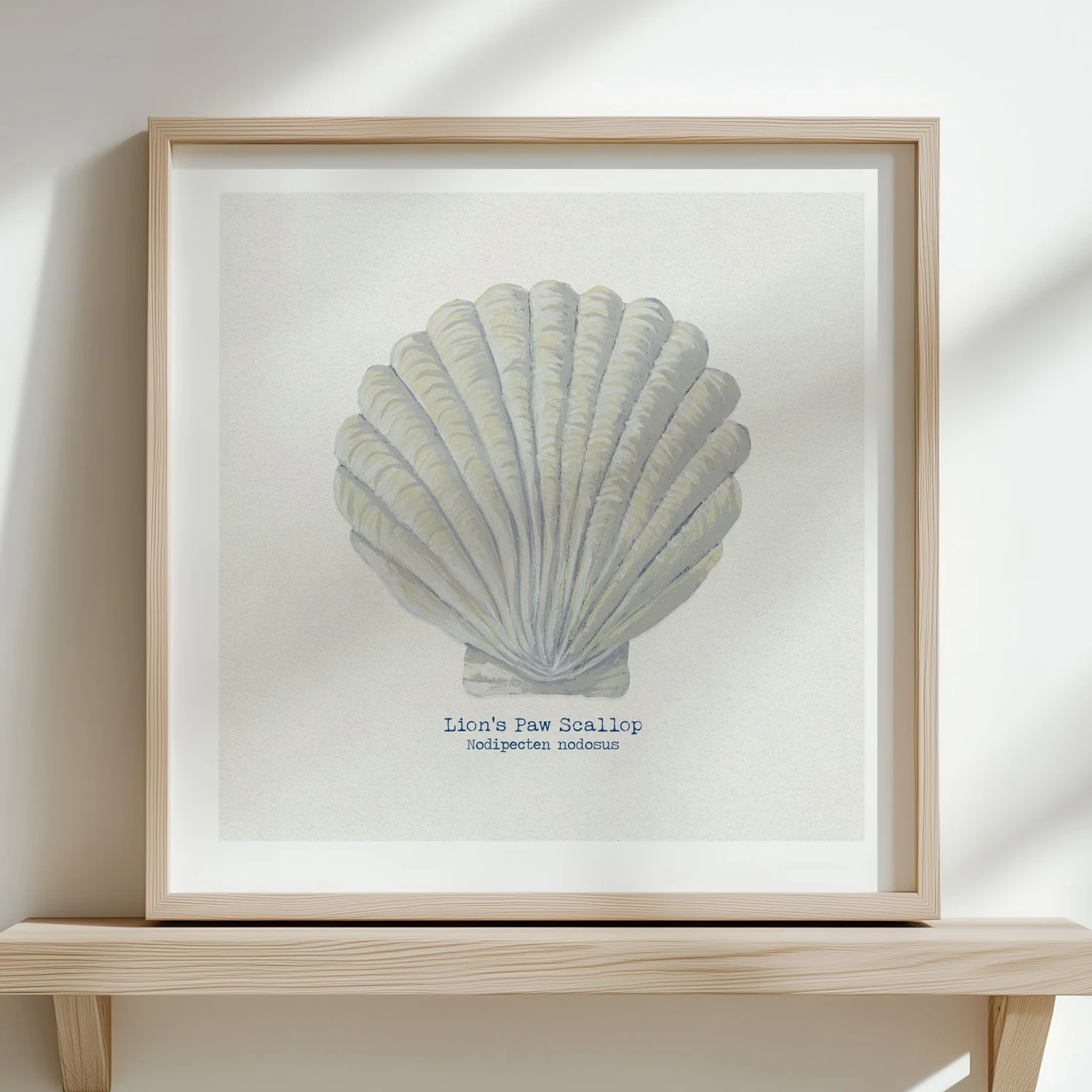 Our detailed illustrative style brings the classic radiating ribs and elegant fan shape of the Fan Scallop to life, making it a captivating piece of coastal wall art.