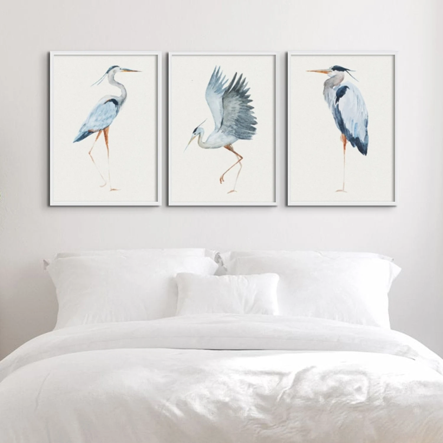 Beautiful wall art prints of contemporary Herons in three different poses. Painted with dreamy watery colours on a neutral paper background that complements any interior.