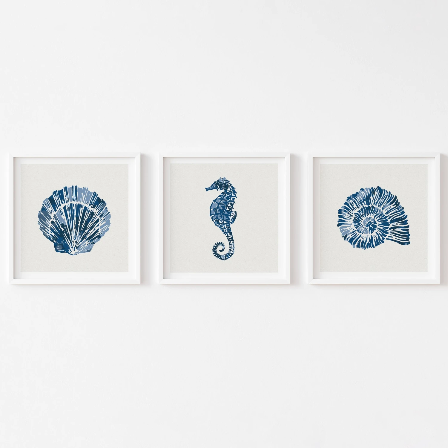 Introducing our stunning set of indigo blue coloured seahorse, coral, scallop, and spiral shell art prints, designed to bring a touch of coastal beauty into your home.