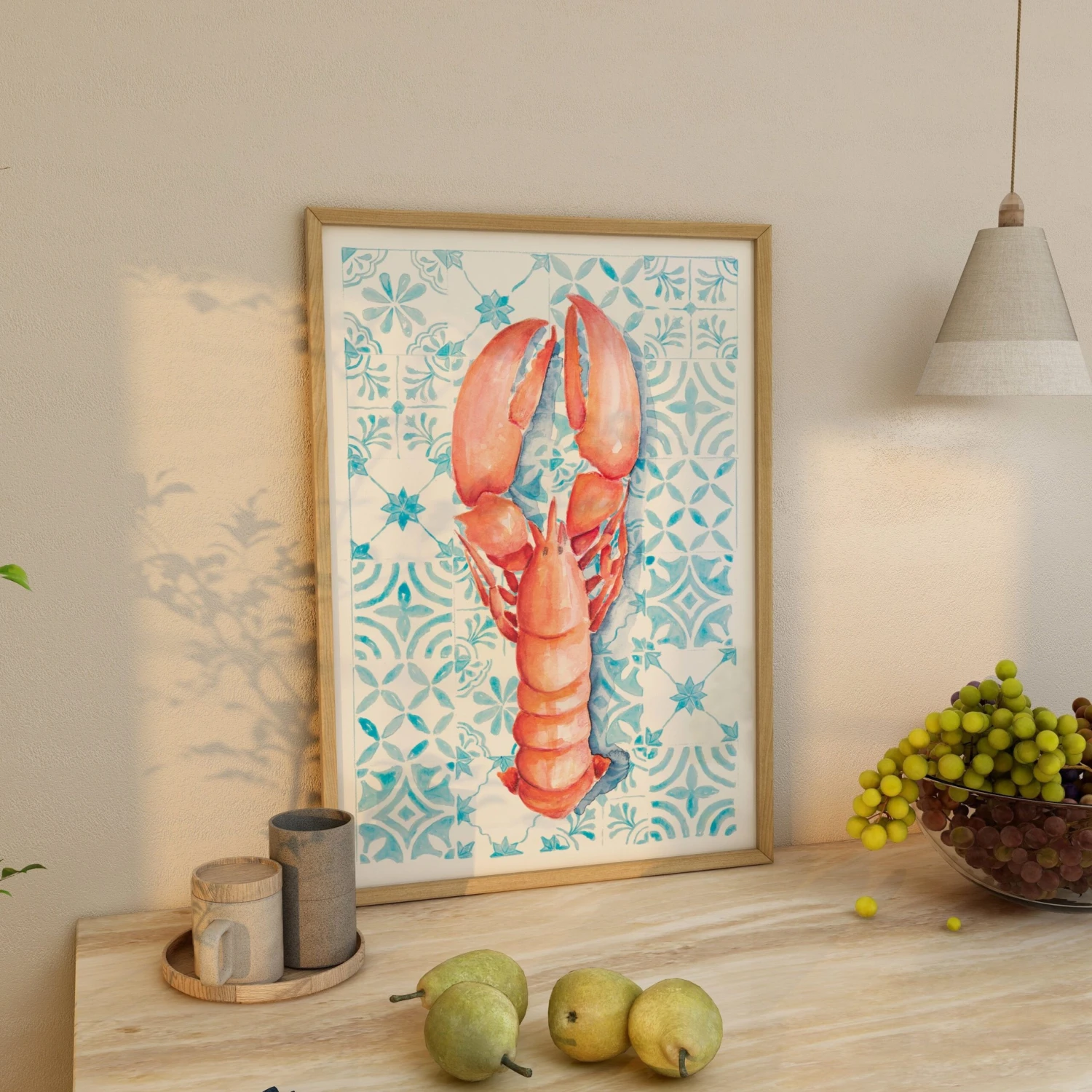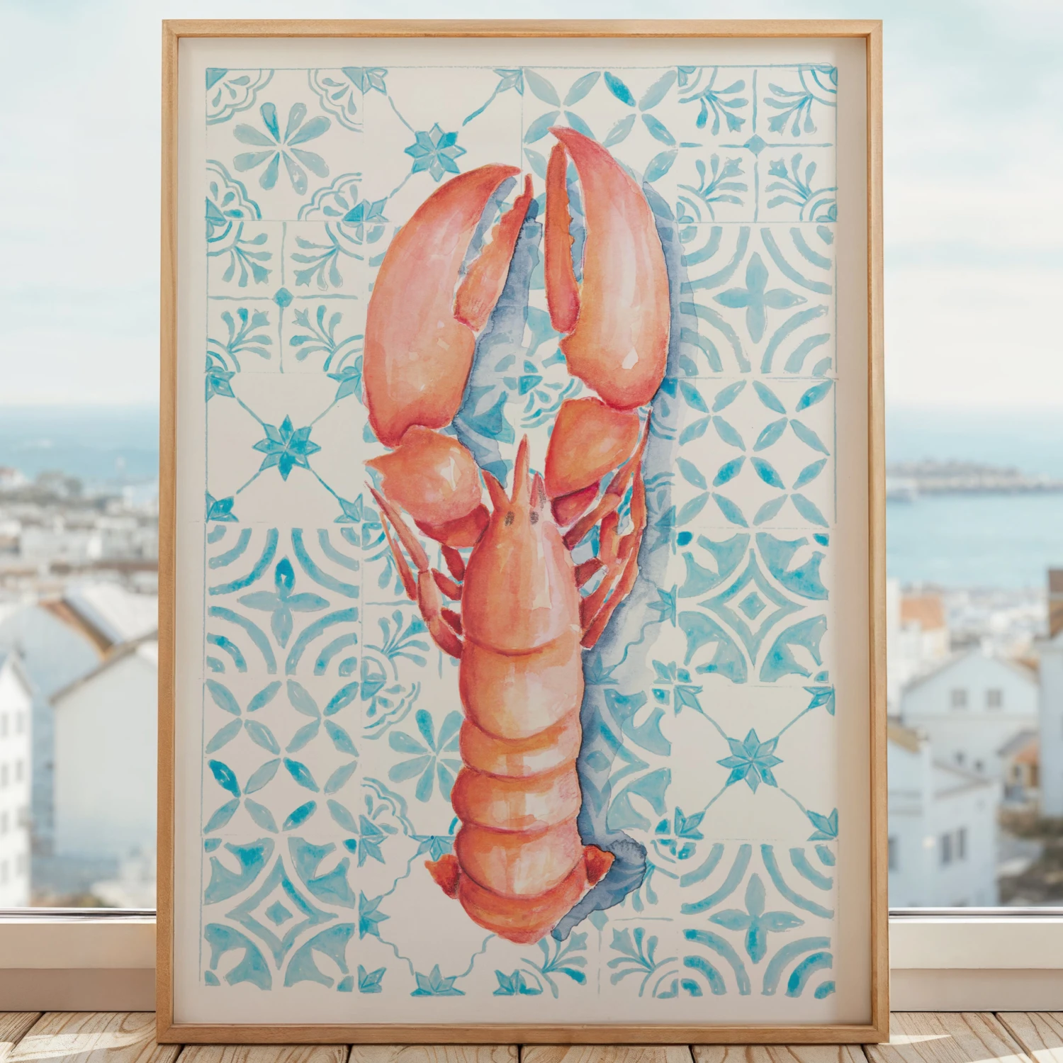 This stunning framed lobster features a watercolour painting of a lobster on azure tiles, perfect for capturing cherished memories of a summer Mediterranean holiday.