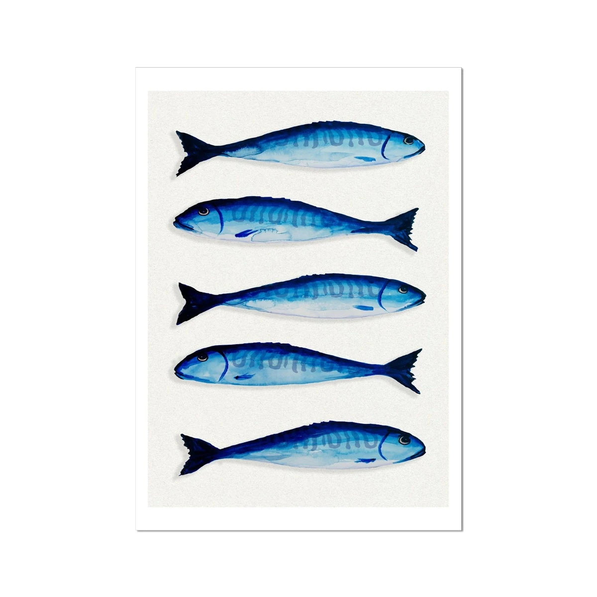 A high-quality print from an original watercolour painting of a beautiful set of mackerel; a stylised fish art print, ideal for every kitchen on a neutral paper background.