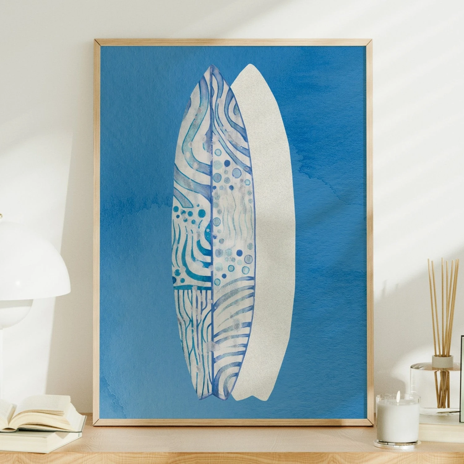 This beach art print of two surfboards bring dreamy, coastal blue art into your interior.