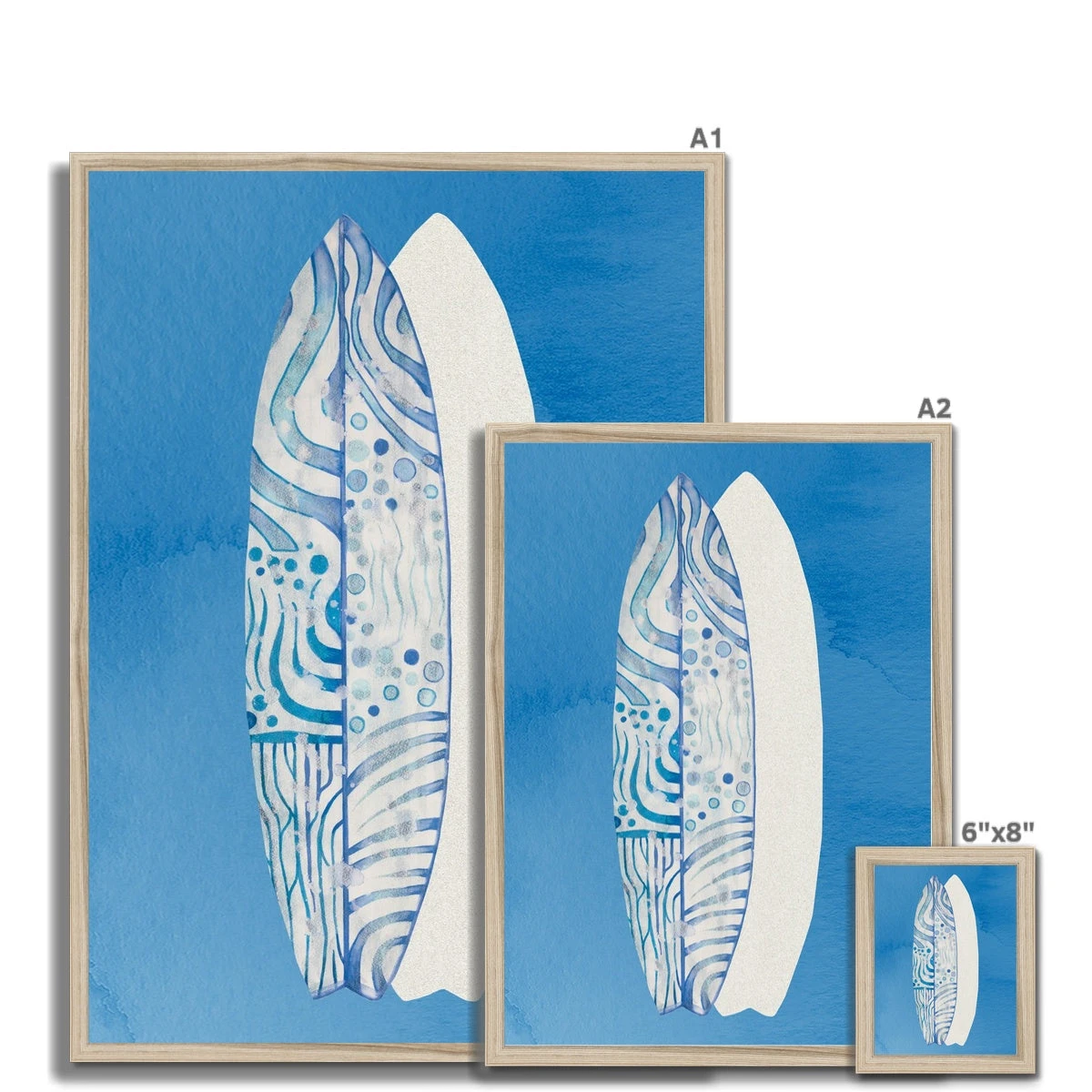 This stunning wall art print features a striking surfboard design in watery blues, adding a touch of beach vibes to any room. The two surfboards set against a blue watercolour background is beautifully framed, it’s a must-have for any surf lover’s home.