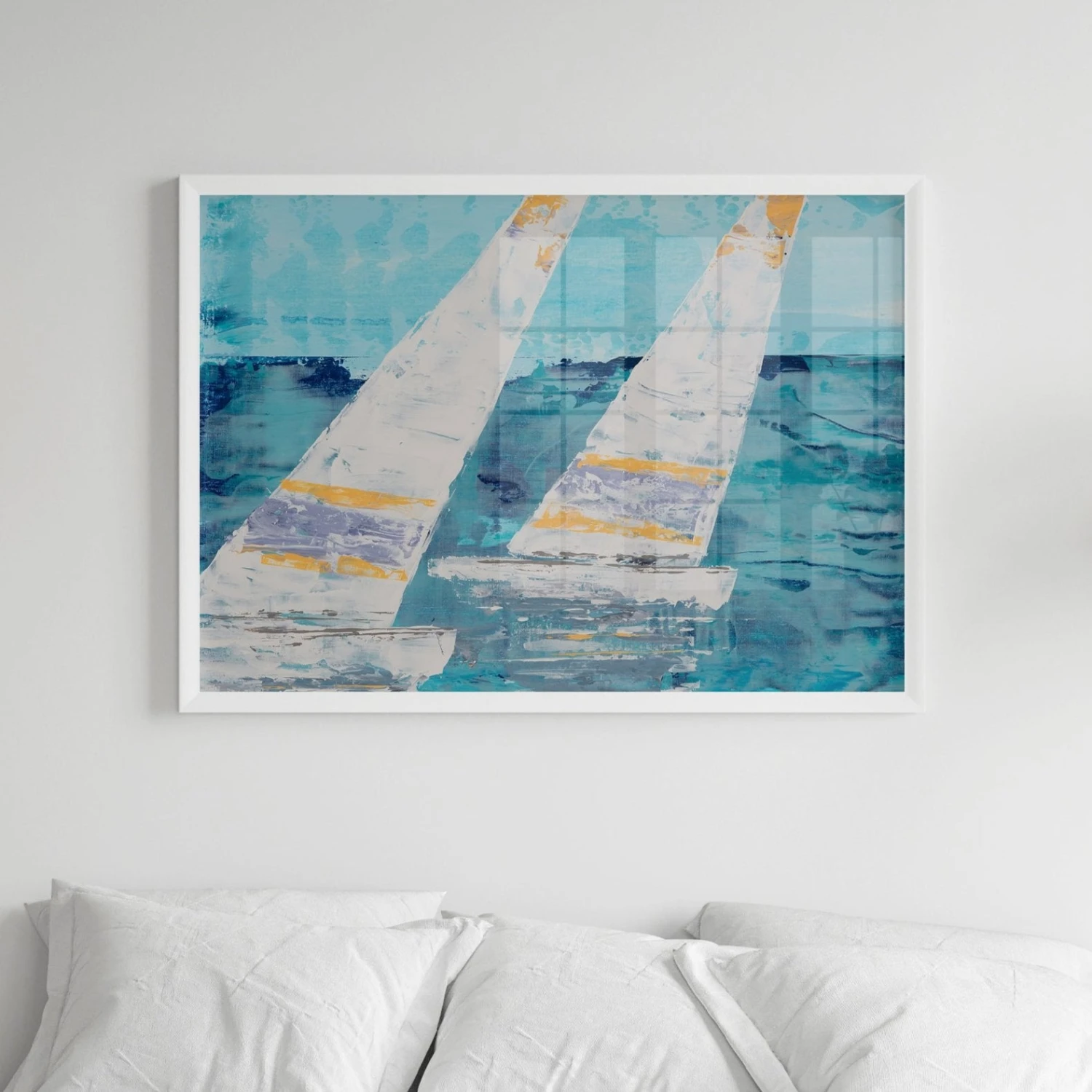 Featuring a dynamic composition of two white sails against an active blue sea backdrop, this painting invites the excitement of the sea into your space.