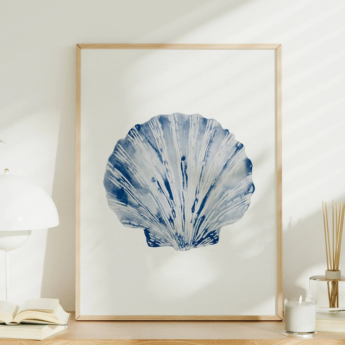 Add a touch of coastal charm to your home with our navy blue shell art. This print of an original painting by our Beach House Studio, showcases a beautiful watercolour of a Fan Shell. Perfect for any coastal interior, it’s a must-have for sea lovers and interior enthusiasts alike!