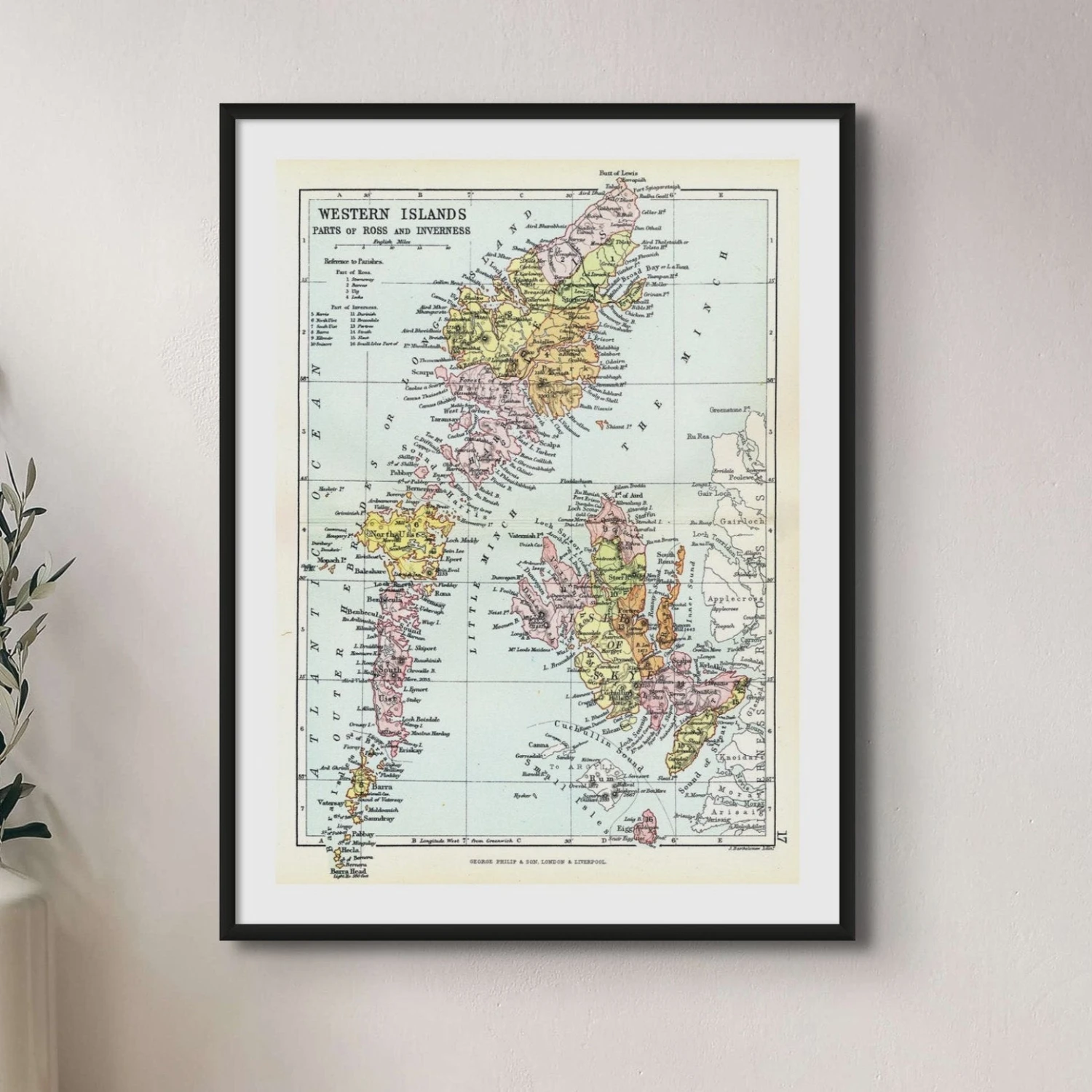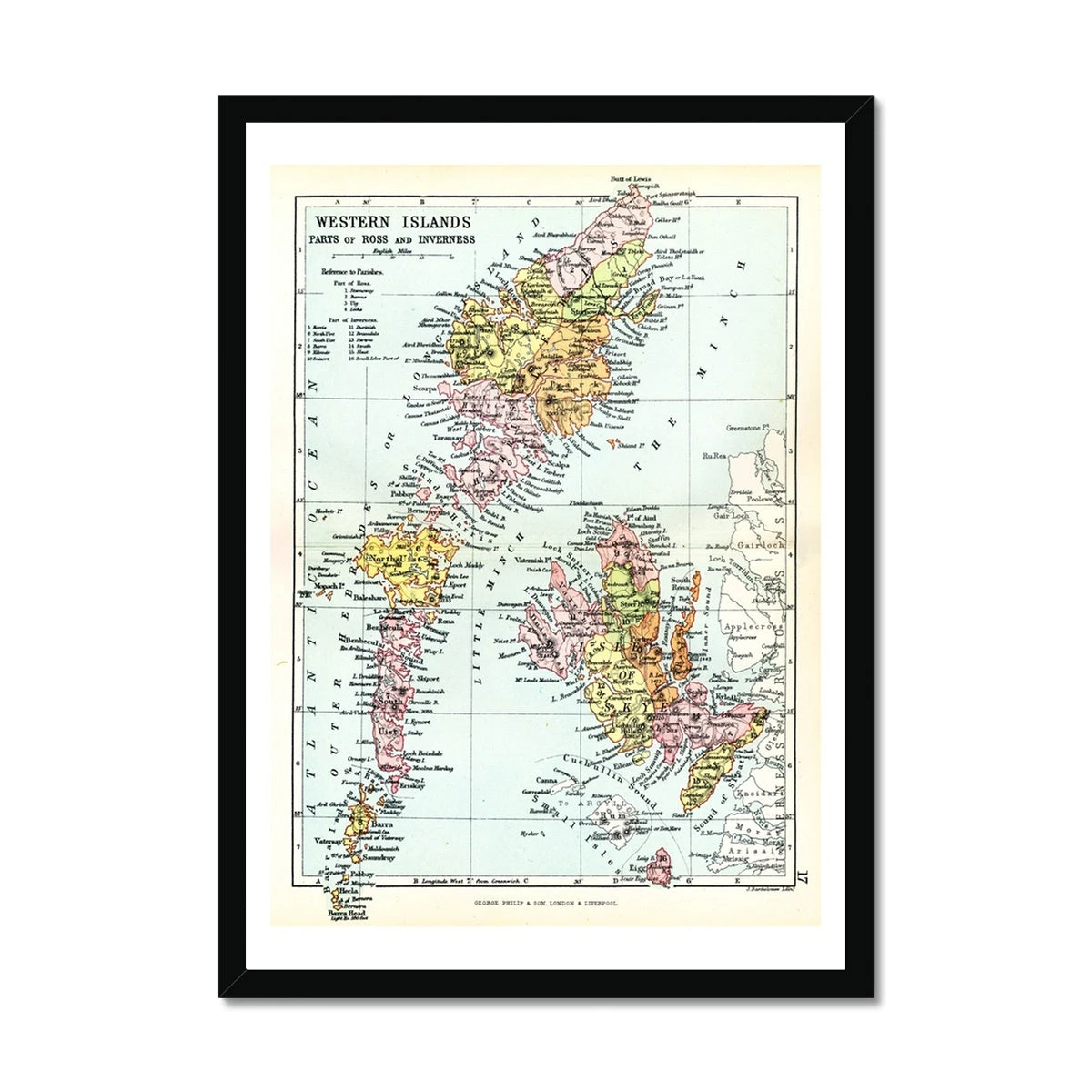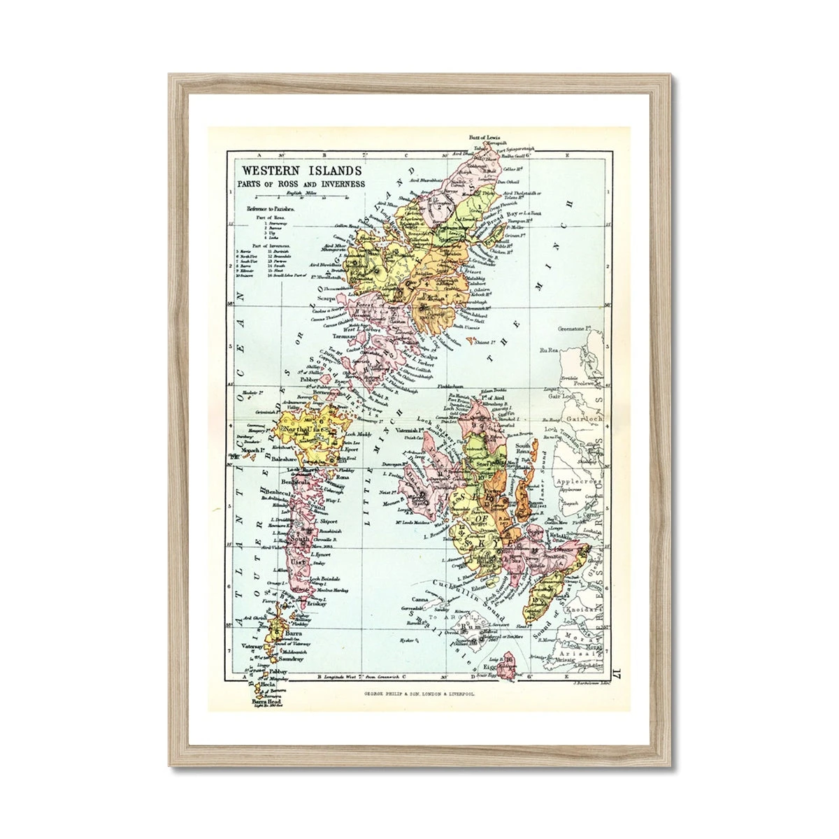 More than just a decorative piece, this framed print invites conversations about the unique geography and heritage of the Western Isles. the print includes, the Isle Of Skye, Harris and Lewis, Eigg and Rum and Barra and Uist.